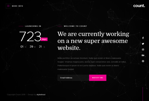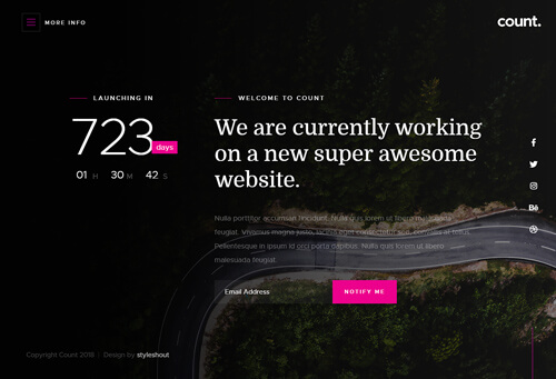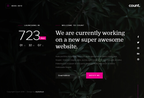 Count is a creative and modern free coming soon website template. It is beautifully handcrafted and built with attention to details. Its professional and modern design with its great typography makes it an ideal template for agencies, startup businesses, portfolios, and other creative and innovative professionals. Count is fully responsive and retina ready, it will look great and sharp no matter what device it is being viewed on. It is available in three style variants: static, slideshow and particle background.